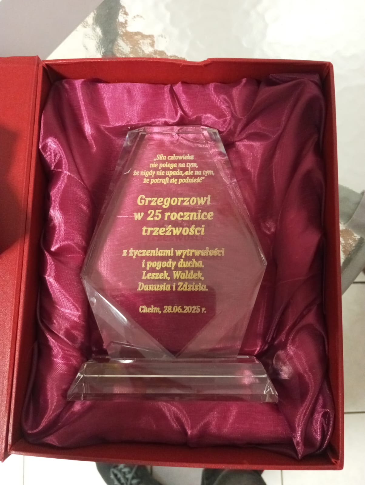 Dnia 28.06.2025 w naszym stowarzyszeniu odbył się wielki jubileusz dwóch naszych członków: 25-lecie trzeźwości Grzegorza i 10-lecie trzeźwości Stanisława. Impreza odbyła się w ramach zadania Trzeźwościowego Forum Promocji Zdrowego Stylu Życia w Remizie w Krobonoszy, gdzie zgromadziło się przeszło 60 osób - ich bliskich i przyjaciół, którzy uczcili tak wielki triumf silnej woli, ciężkiej pracy i żywego dowodu na to, że wszystko jest możliwe. Bogata oprawa uroczystości nadała temu wydarzeniu imponujące znaczenie, które uświetnił nasz Zespół „Żyje się raz". Były też przemówienia, świadectwa abstynenckie osób, dla których ta rocznica była żywym udziałem w ich życiu. Znalazł się także czas na życzenia, dedykacje, nagrody i puchary. Uroczystość poprowadził Leszek Siwiec